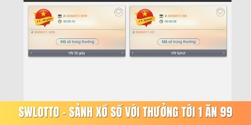 SWLOTTO, cái tên đã quá nổi bật trên thị trường, hiện đang có mặt tại 79king. Sảnh cung cấp cho các hội viên rất nhiều trò chơi xổ số chất lượng, hấp dẫn. Về cơ bản, khách hàng có thể tham gia lô đề 3 miền, siêu tốc, VIP… Đáng nói, nền tảng đảm bảo cơ chế cược phong phú cùng tỷ lệ thưởng lên tới 1 ăn 99.